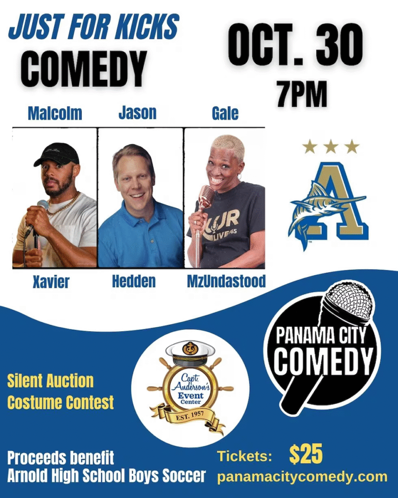 The second show, “Just for Kicks Comedy – AHS Boys Soccer Fundraiser,” is scheduled for Thursday, October 30, 2025, at 7 p.m. This event will take place at Capt. Anderson’s Event Center, located at 5550 North Lagoon Drive, Suite 2, Panama City Beach. This night of comedy is dedicated to raising funds for the Arnold High School Boys Soccer Team.